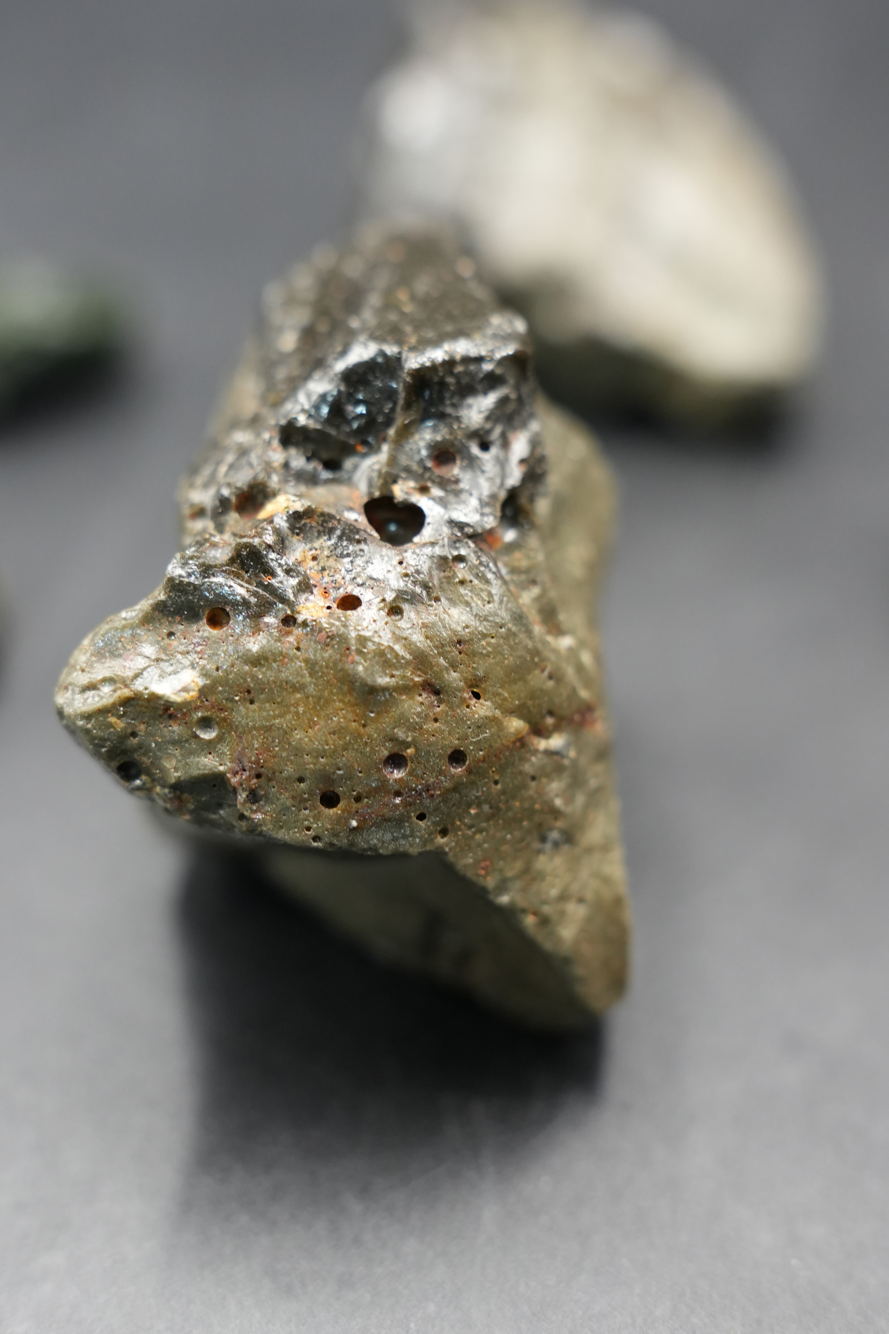 陨石的粗糙、多孔表面。暗绿色为基调,细小气泡孔洞清晰可见,这是熔融物质快速冷却、气体逸出形成的痕迹。表面略带光泽的黑色熔壳与棕红色斑点,可能源自高温灼烧和矿物杂质。凹槽与不规则形态,是玻璃陨石穿越大气层、撞击地表过程的真实印记。