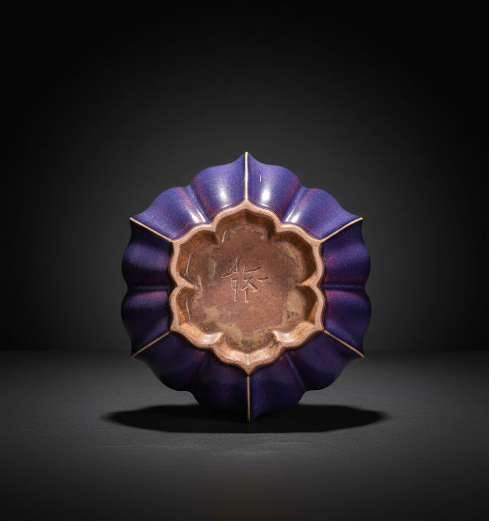 底部圈足同为海棠花形,足内露胎,胎色呈酱黄或浅褐色,质地坚致。中央刻有“蔡”字款,为宋代钧窑御制器的典型标识之一。紫釉在足边凝结厚实,光泽深沉,釉面盈润如脂,尽显宫廷御窑气度。