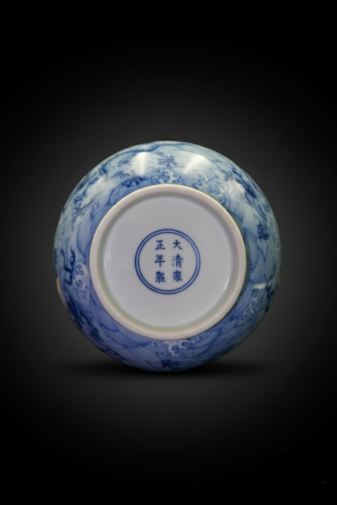 瓶底圈足修整规整,内施白釉,中央以青花书写“大清雍正年制”六字三行楷书款。笔意端正,神采饱满,青花发色纯正稳重。此类款识为典型的雍正官窑特征,显示出其御窑监制的高贵身份与非凡品质。