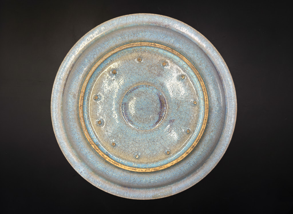 此盘为一件元代钧窑天蓝釉折沿盘,造型端庄典雅,展现出元代钧瓷成熟时期的艺术风貌与工艺精粹。全器口径24.7cm、底径15.5cm、高3.5cm,比例协调、造型规范。釉色温润如玉,凝重而富于层次感。