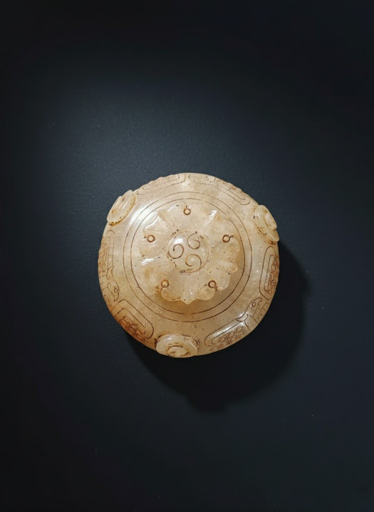盖部呈圆形,中央凸起雕刻一朵六瓣花纹,花瓣间隐现漩涡与流云装饰。盖沿环绕四组简化兽面或龙纹,线条挺拔、构图严谨,体现了汉代工艺的秩序美与象征意义。