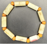 介绍: 八颗长筒状的和田白玉珠子呈淡雅的乳白色,玉质温润,表面可见经年累月形成的自然沁色和包浆。白玉珠间巧妙地穿插着橘黄色的圆润隔珠(似琥珀或老蜜蜡),色彩对比鲜明,既起到固定和保护玉珠的作用,也增添了古朴的装饰性。其中一颗白玉珠侧面可见清晰的红色印记或残留封签,暗示了其流传和收藏的经历,也体现了“名文”的可能意义。