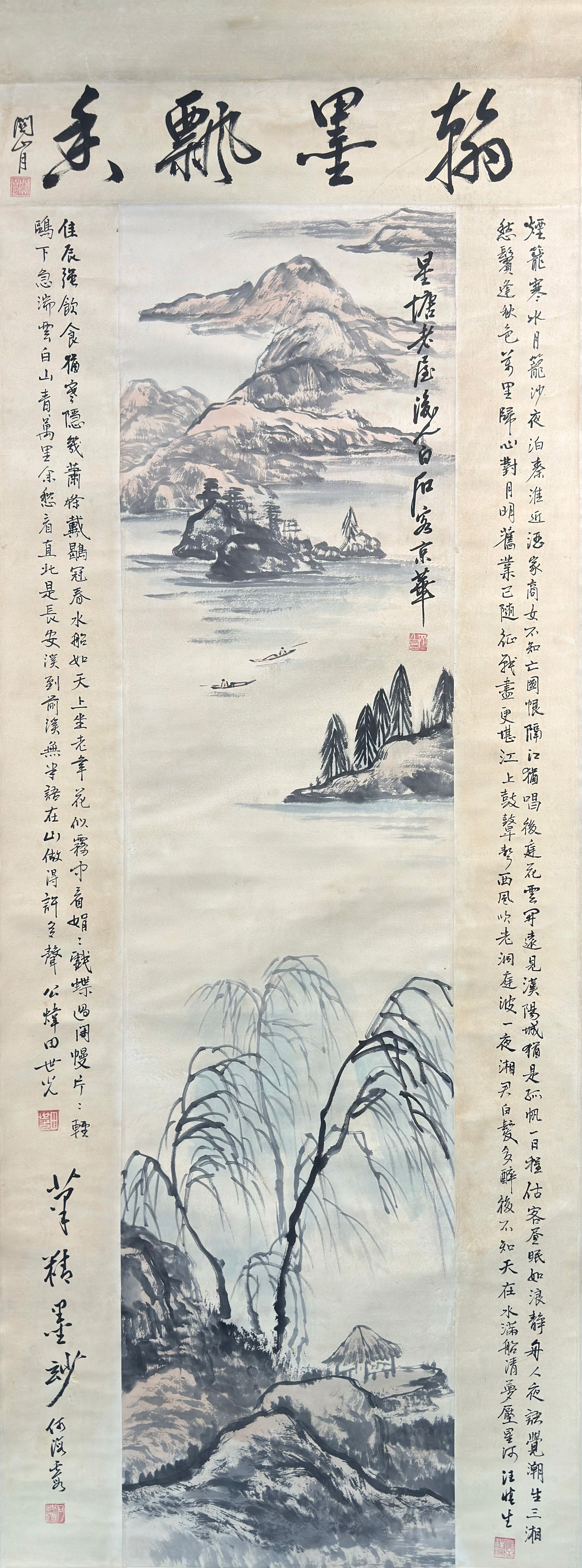 这件尺寸为 145cm x 57cm 的山水作品,其价值不仅在于笔墨技法的精湛,更在于它承载了齐白石对传统文人画的继承与创新。