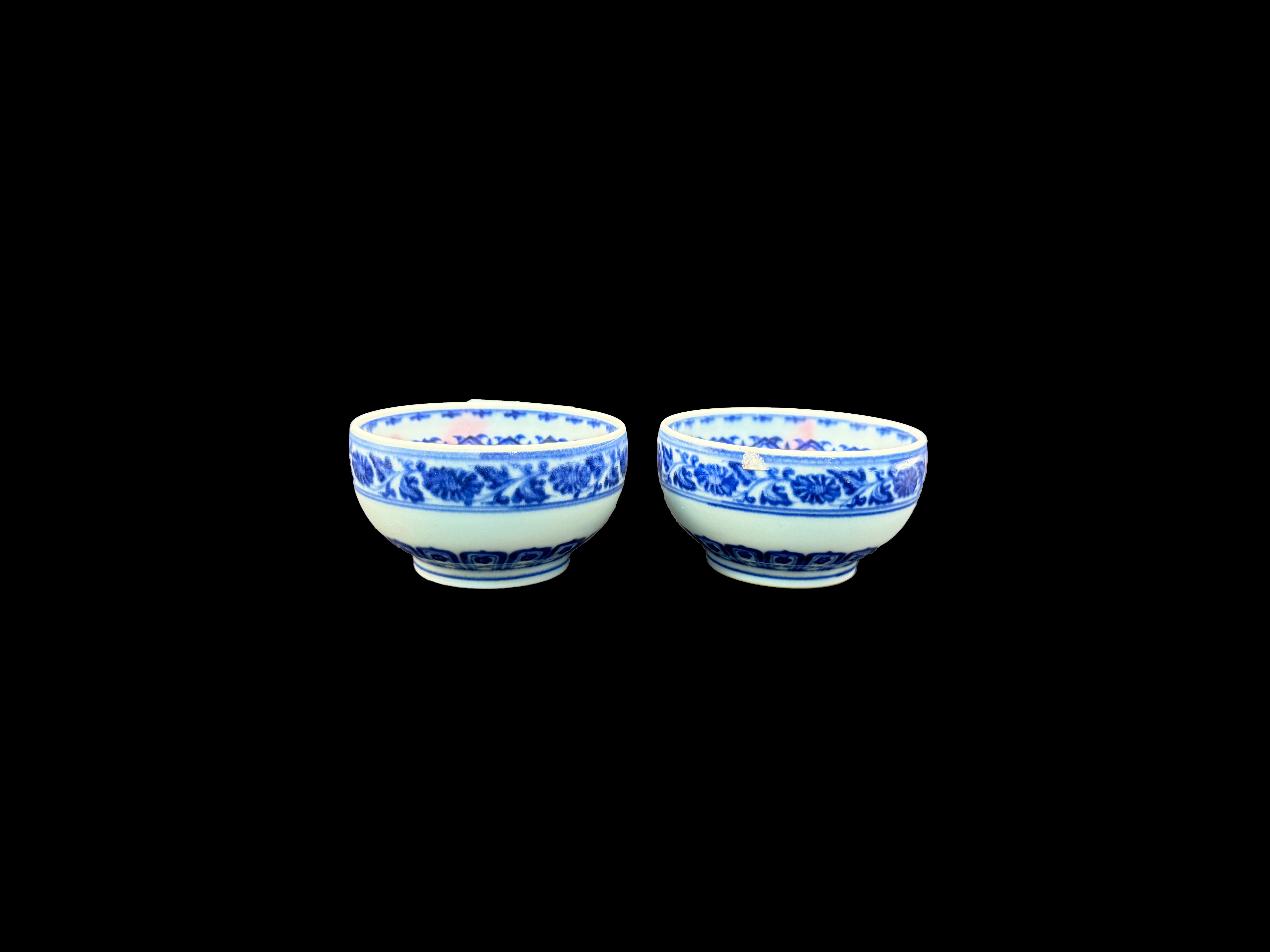 这是一对精巧雅致的青花卉纹扣碗。这对扣碗口径约 8cm,高约 4.5cm,底径约 4.2cm,胎质坚实,外壁饰有清新的青花缠枝花卉纹。器物整体品相完好,具有较高的观赏和收藏价值。