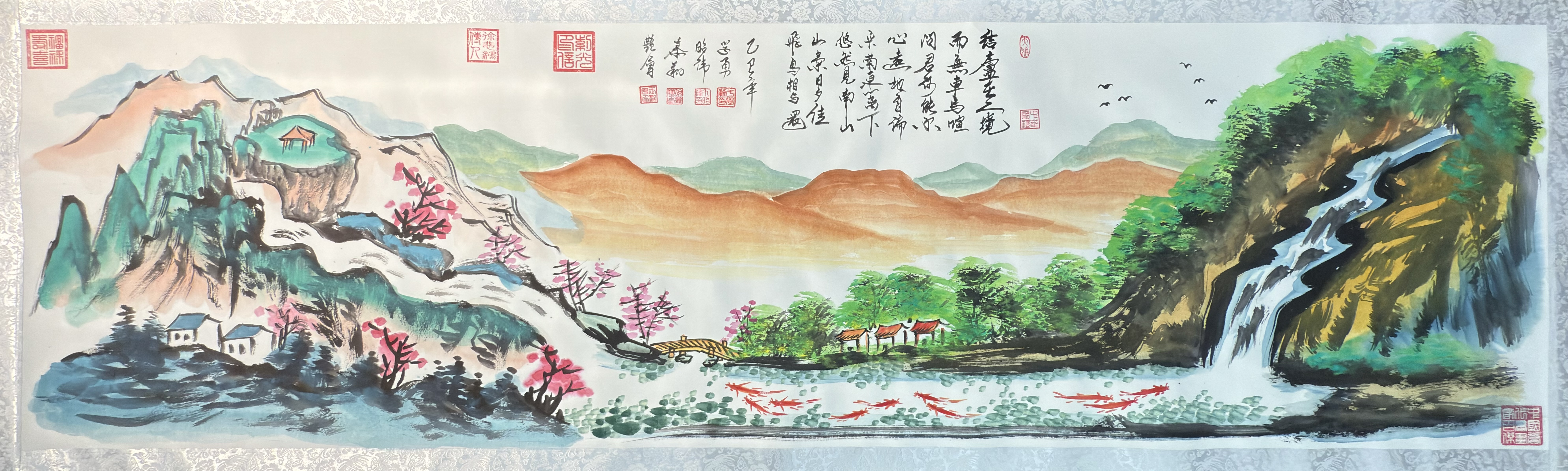 全景图展示了画作的完整面貌,画面左侧山峦叠翠,高耸入云,山顶有凉亭掩映,象征高瞻远瞩;山腰及山脚下桃花盛开,寓意鸿运当头、春意盎然。中景处,群山连绵起伏,如同坚实的屏障。前景则是一片生机勃勃的平湖景象:清澈的水面上,数尾红色锦鲤嬉戏游动,寓意年年有余、富贵吉祥。湖边绿树成荫,房屋整洁宁静,象征安居乐业。右侧,一道飞流直下的瀑布,声势浩大,有财源滚滚、源远流长之美意。整幅画作依山傍水、聚财纳福的布局,完美契合了“富居宝地”的主题。