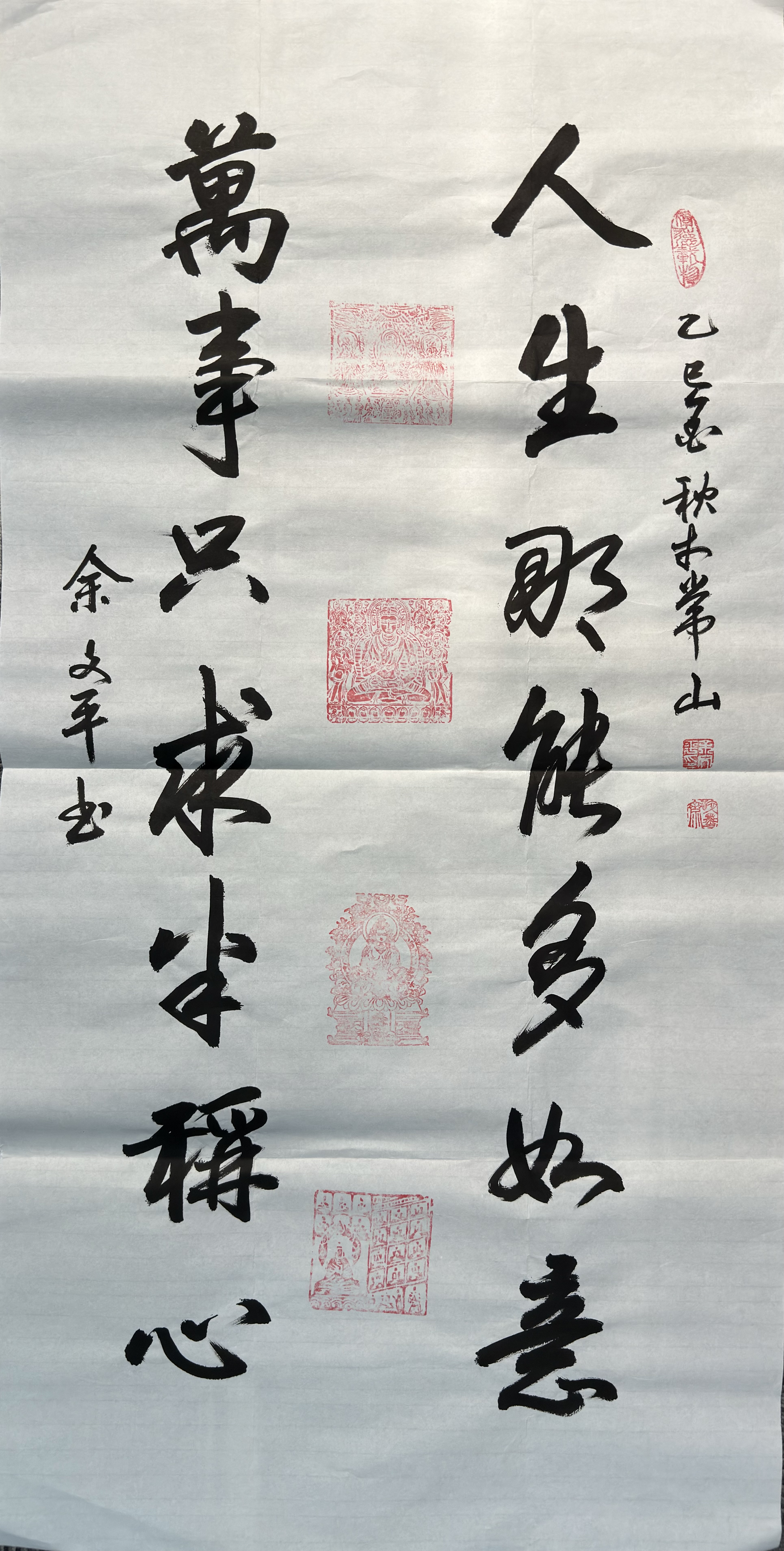 这幅作品是余文东先生所书的四尺整张竖幅,尺寸约为 99.7cm x 50cm。作品书写内容是富有哲理的禅语:“人生哪能多如意,万事只求半称心”。