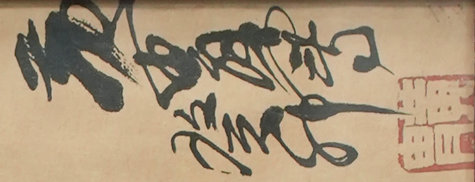 画面中可见黄胄以行草笔法题写款识,笔势自然流畅,与画面中奔放而概括的水墨语言保持高度一致。题款位置处理得当,不喧宾夺主,却在整体构图中起到稳定画面的作用。旁钤朱文印章一方,印文端正朴实,与水墨形成鲜明对比,在视觉上形成点睛效果。