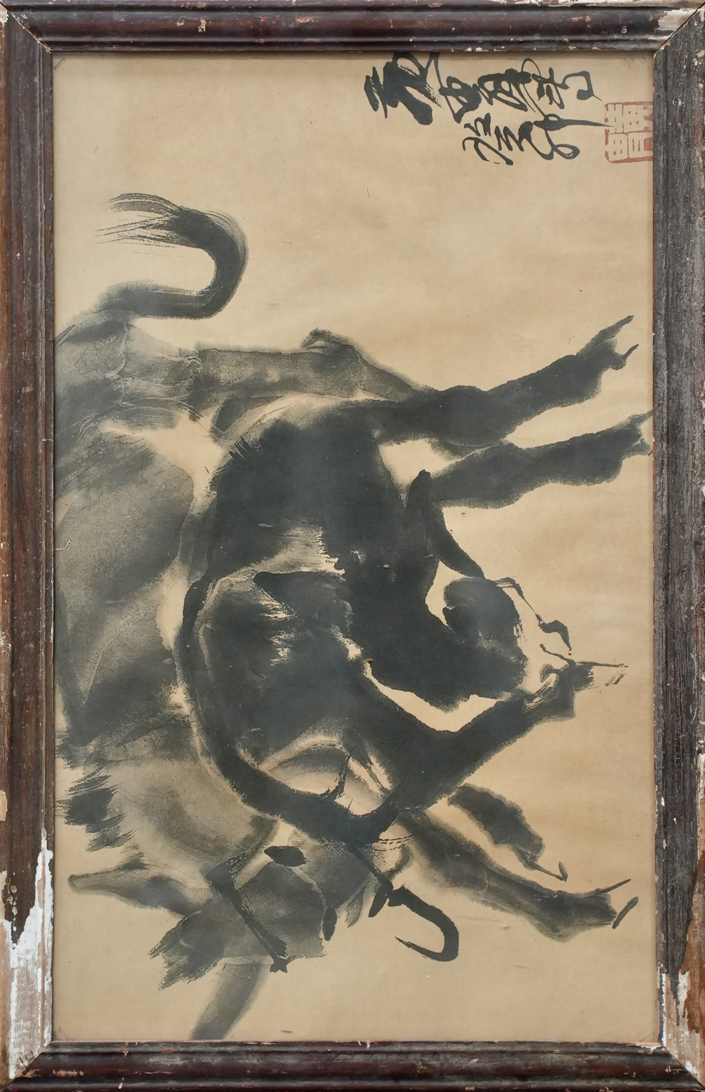 从笔墨语言来看,此作体现了黄胄“以速写入画”的鲜明特点。驴子的筋骨结构以浓墨勾勒,形体转折处辅以淡墨过渡,线条简练而富有弹性。画家并未刻意追求细节的繁复刻画,而是以高度概括的方式,捕捉动物瞬间的动态与精神状态,使作品呈现出直接、生动而成熟的艺术面貌。