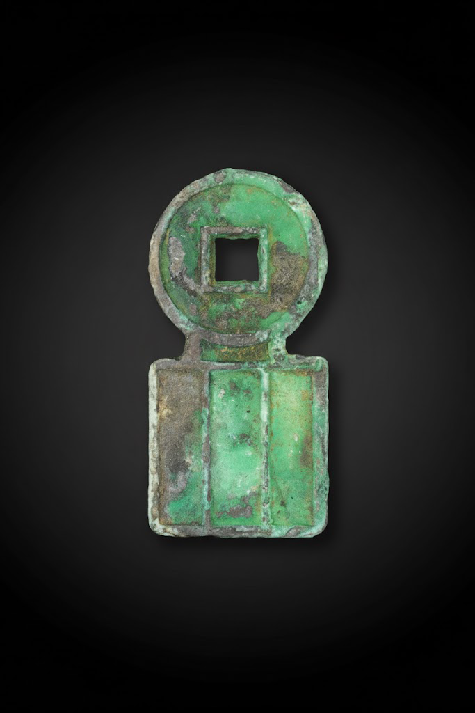 光背或仅留浅纹,整体铜质斑驳,包浆自然。币身下部可见三道竖纹结构,呈现出历经岁月的古朴质感,铸造痕迹清晰,保存状态良好。