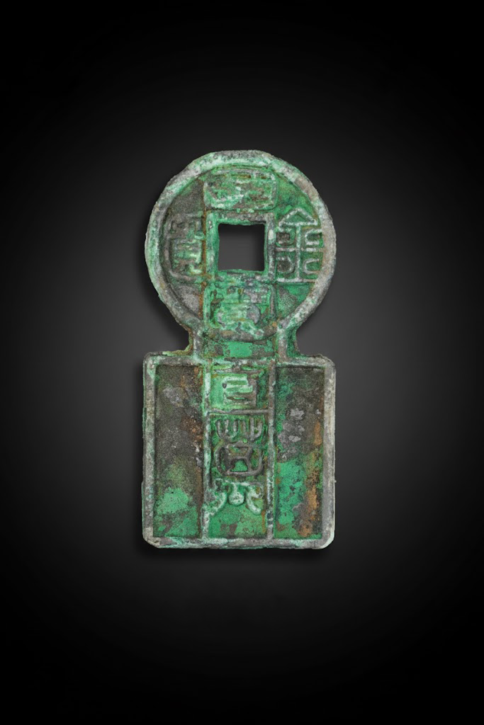 “国宝金匮直万”的正面,上部圆钱部分自上而下、自右向左铸有“国宝金匮”四字,下部方形主体从右至左铸有“直万”二字。钱文为悬针篆体,笔画修长而有力,布局严整,体现出新莽时期精湛的铸币工艺。