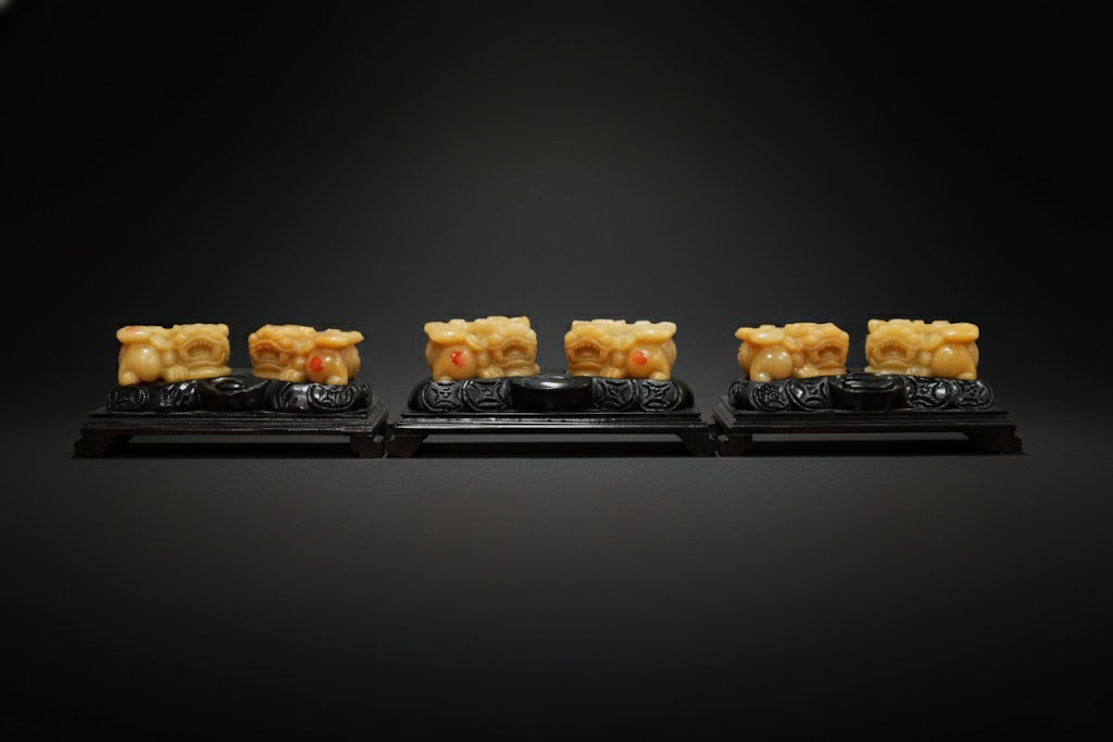 这三组黄龙玉貔貅摆件整体尺寸为 7cm × 5.58cm,由上等黄龙玉精雕细琢而成。玉质细腻温润,色泽如蜜如蜡,呈现出柔和的金黄色调。整组摆件共由六尊貔貅组成,均配以定制仿红木雕花底座,构造庄重典雅,兼具审美价值与陈设气韵。黄龙玉以坚韧如翡翠、润泽似田黄著称,其独有的金色光感寓意尊贵与富足,是集材质之美、雕刻之精、寓意之祥于一体的精品之作。