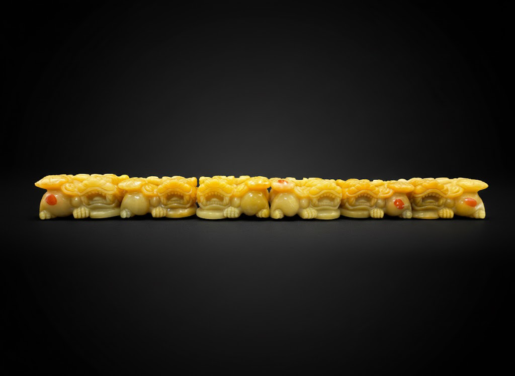材质特性: 黄龙玉莫氏硬度达 6.5–7,兼具翡翠的坚韧与田黄的色泽,金黄温润、层次丰富,在光线下尤显通透华贵。