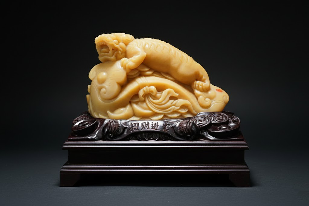 如意象征事事顺遂,与貔貅结合,更寓意“如意生财、福气盈门”。底座的铜钱与元宝元素与黄龙玉的金色光泽相映成趣,象征金玉满堂、富贵长存。