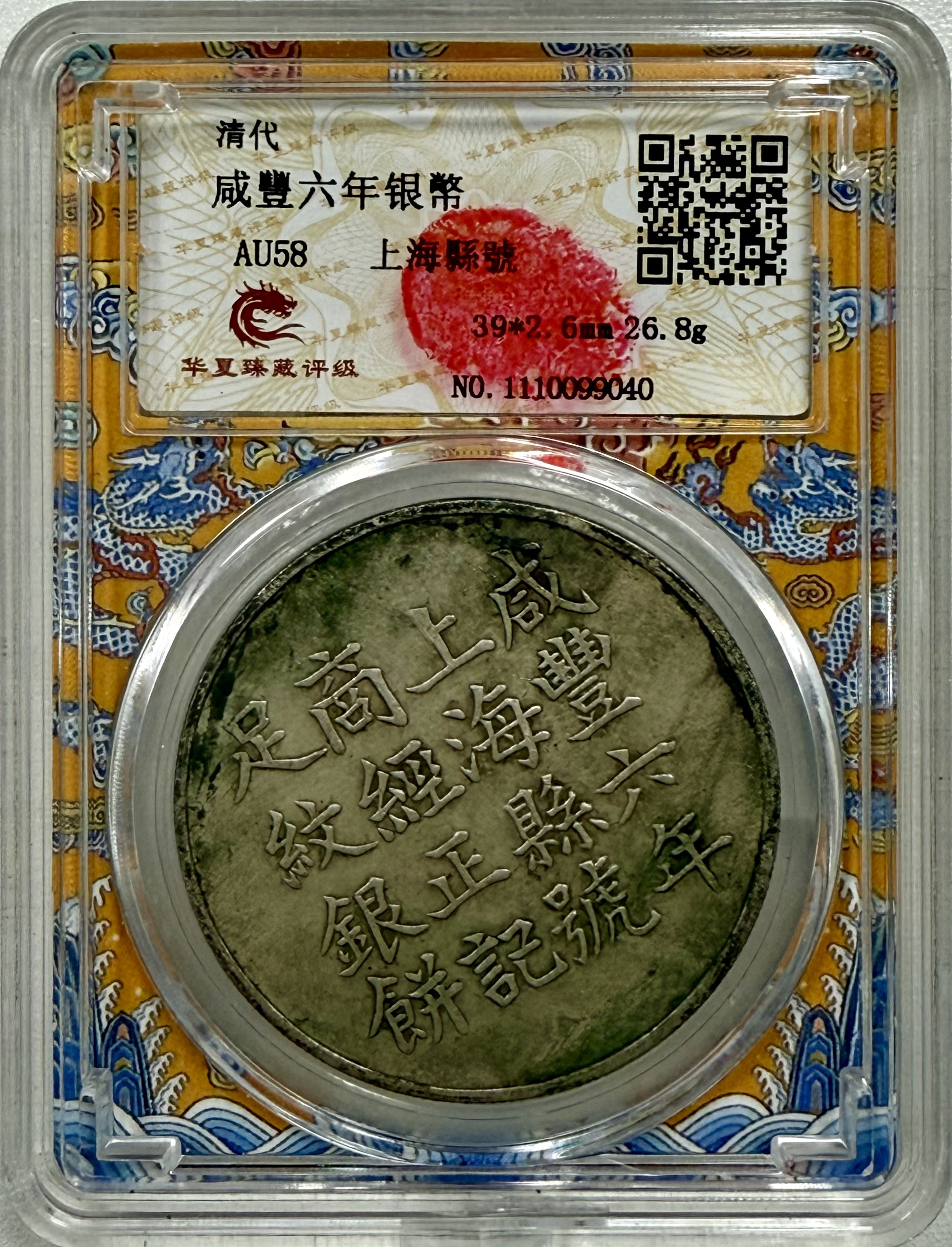 正面刻有“咸丰六年 上海县号 商船经正 纹银饼”字样,布局规整,刀工劲挺。文字自右向左排列,典雅古朴,呈现出清代钱币特有的端正气韵。从鉴定盒标签可见,该币经“华夏臻藏评级”,评级为 AU58,表明其保存状态良好,银光犹存,流通痕迹轻微。