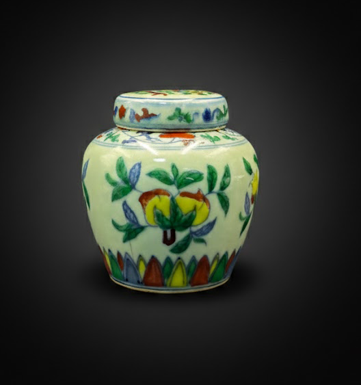 罐腹部线条饱满圆润,主体纹饰为折枝寿桃纹,寓意多福多寿、子嗣绵延。果实以填黄挂红之法绘制,色彩层次鲜明、立体感强烈。叶片层层晕染,绿彩深浅相间,既富生机,又显古雅。罐体下沿一圈多彩莲瓣纹环绕,如莲花托举,使整器比例协调、层次分明。整体造型秀美端庄,尽显明代文人追求的“清、雅、秀、润”之风。