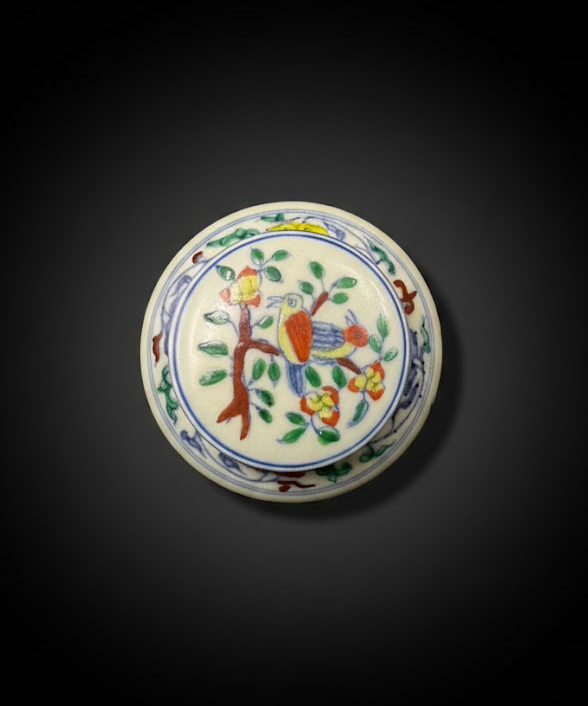 平顶盖面绘有一幅花鸟栖息图,一只灵鸟立于枝头,姿态安然,花叶繁茂。画面构图疏密有致,运用釉下青花勾线与釉上彩绘相结合的技法,色泽柔和而层次分明。红彩浓艳而不俗,黄彩明亮如金,绿彩淡雅清润,展现出成化斗彩独有的鲜丽与温婉。