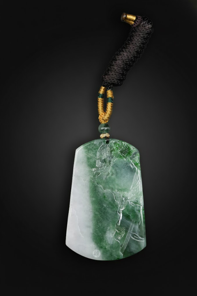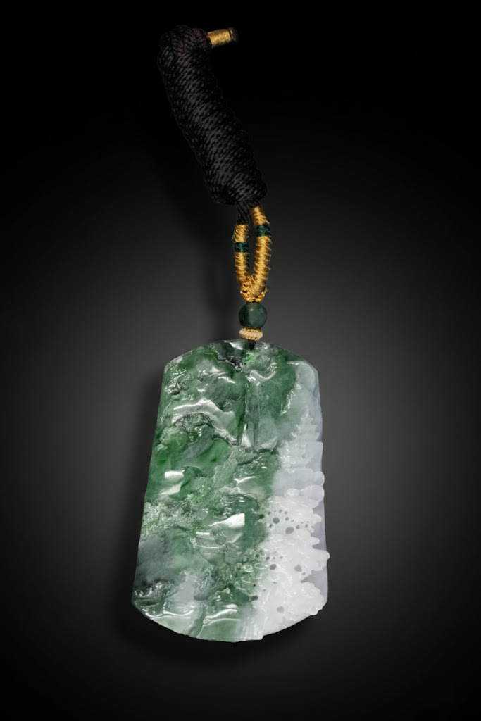 此牌色泽分布极具层次感,翠色与白底交融晕散,宛如山岚水气在玉中流动。翠色自然渗透至玉质内部,形成“色随种走”的灵动韵味。通体温润光洁,透度良好,在光照下可见细密纤维交织结构,充分展现了天然A货翡翠的原生美与生命力。