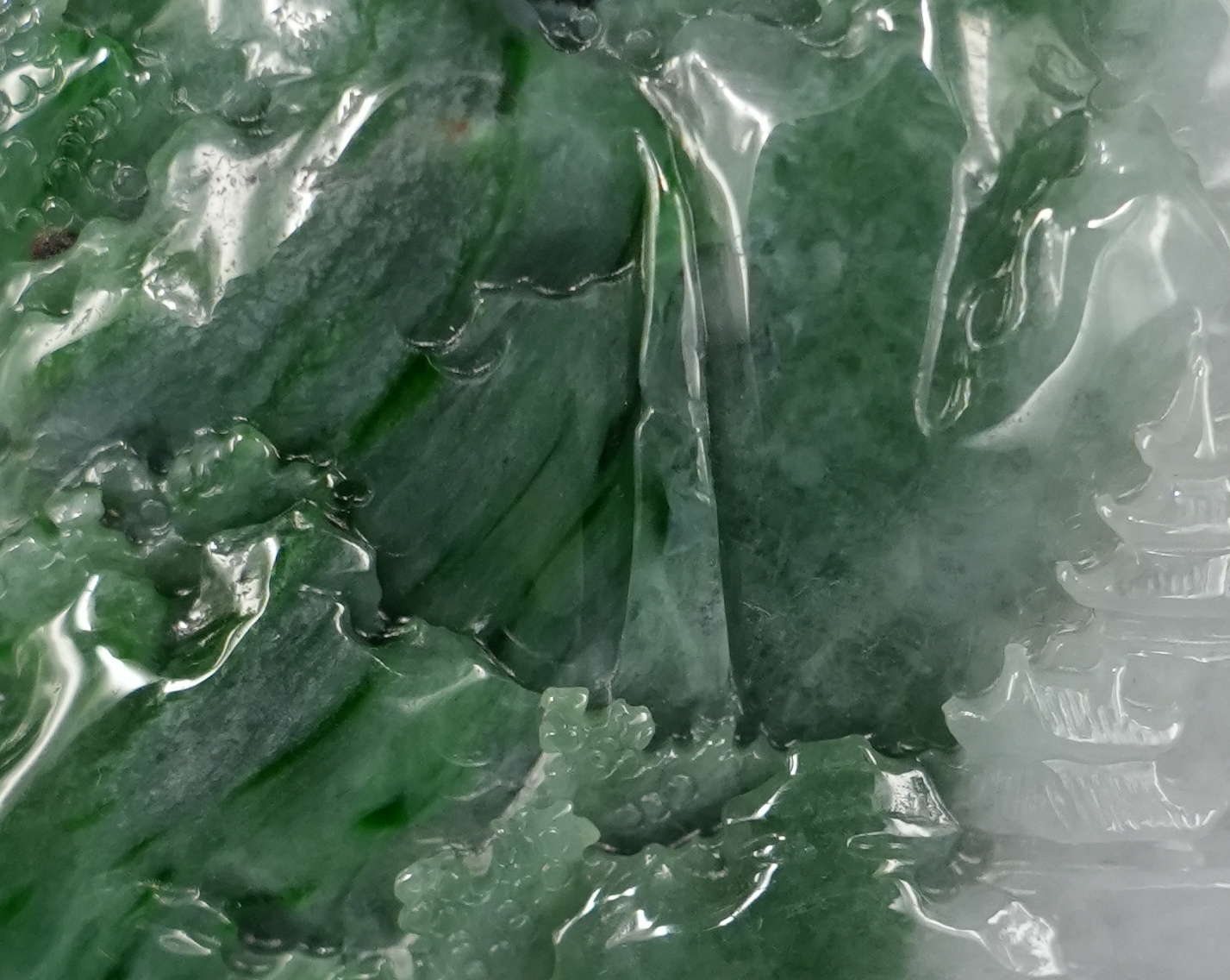 工匠刀法收放自如,山石转折果断有致,亭阁线条流畅自然。雕面光影错落,利用翡翠本身的光泽营造出波光粼粼的视觉效果。种水之间透出温润质感,局部呈“冰种似糯”之光,光下细观,更显灵动与深邃。