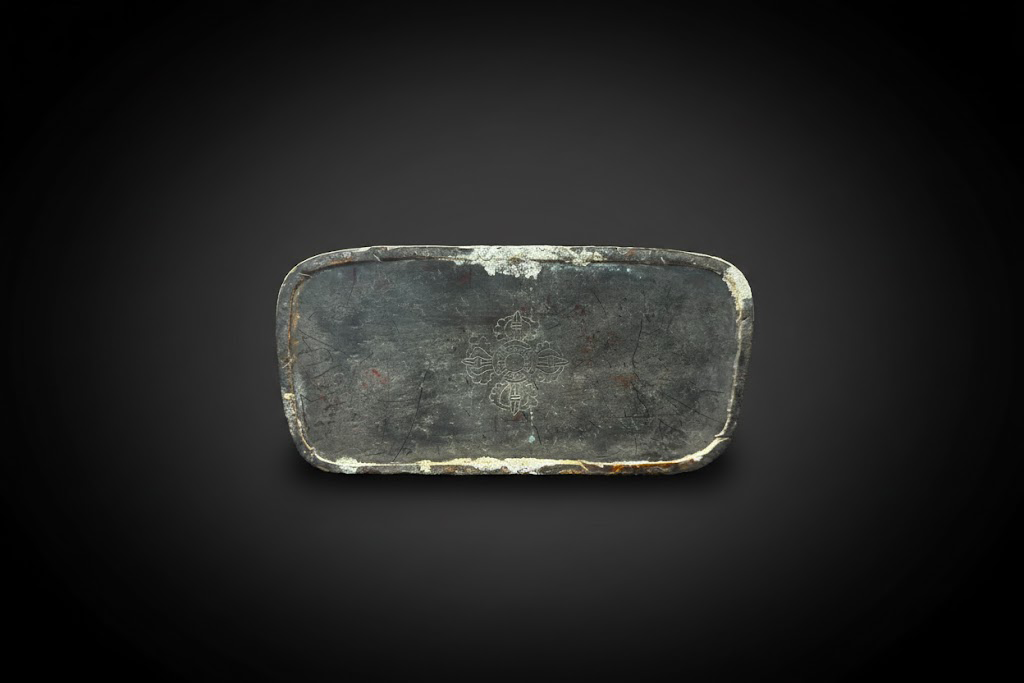 中心錾刻有十字金刚杵纹饰,象征佛法坚不可摧、镇守四方,体现了宗教造像中高等级法器的仪轨要求。此类设计不仅具装饰意味,更传递出造像所蕴含的宗教信仰与护法精神。