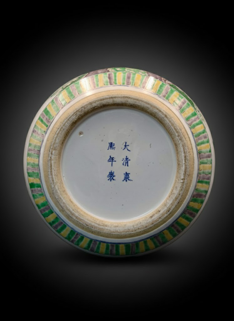 底部直径19厘米,圈足修削平整,露胎处可见自然的干老痕迹。中央以青花书写“大清康熙年制”六字双行楷书款,笔力遒劲,款识端庄,足见其工艺之严谨与时代特征之鲜明。