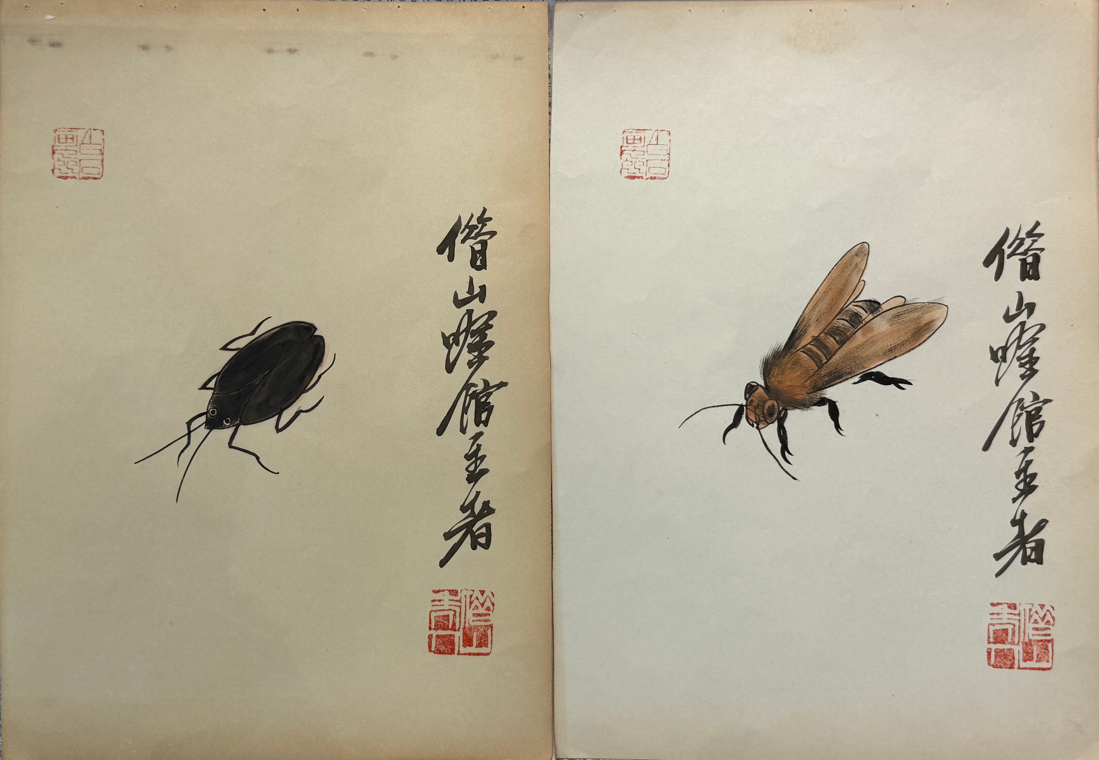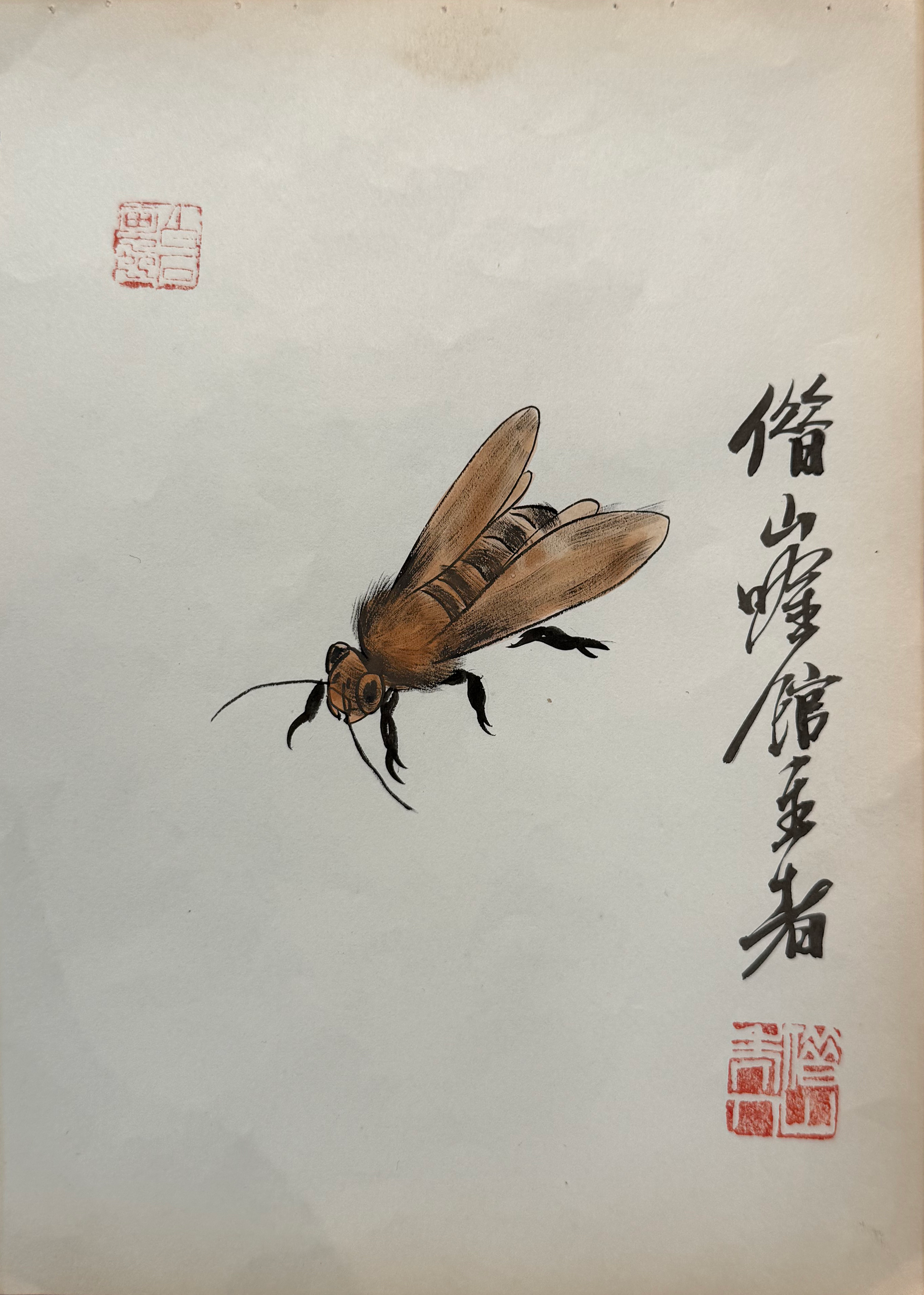 另一幅蜜蜂双翅轻薄如纱,翅脉纹理清晰分明,腹部绒毛呼之欲出,整体姿态灵动自然,仿佛正于花间飞舞。齐白石通过细腻线条和淡墨层次表现昆虫轻盈的动态和生命活力,让观者能感受到纸上微观世界的生机。