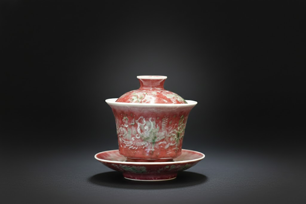 整器比例匀称,盖、碗、托三者相互呼应,曲线过渡自然。釉色在柔光映照下流光溢彩,红中含紫,绿中透青,静中见动。造型挺秀而不失温婉,无论作为陈设观赏还是日常雅玩,皆展现出清代瓷器典雅含蓄的气韵。