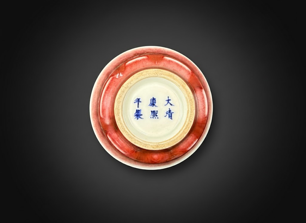 碗与盖的内壁施以洁白细腻的釉层,釉质温润明净,与外壁的红釉形成冷暖对比。碗底书写“大清康熙年制”六字双行楷书款,字体端庄有力,神态稳重。圈足修削细致,胎体洁白坚实,处处流露出制瓷工艺的精准与审美的克制。