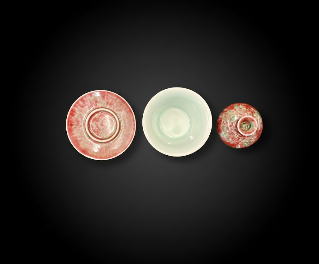 这套清代豇豆红盖碗通体由碗、盖、托三部分组成,高 11.5 cm,造型秀雅端庄,比例匀称协调。豇豆红为铜红釉中的名贵品种,因色如熟豇豆而得名,其烧制过程对火候和气氛的掌控极为考究,釉色常随温度变化而生出层次之美,深受历代藏家与文人雅士的喜爱。
