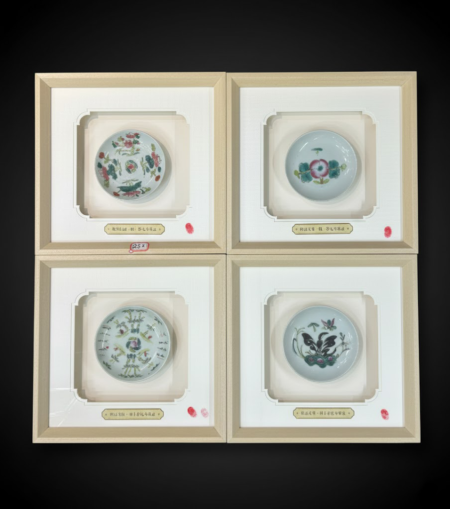 这组瓷器装饰艺术品共四件,直径均为 13.5 厘米,以晚清至民国时期的釉上彩小盘为基础,通过现代木作框架的装裱工艺,使老件瓷器焕发出新的艺术生命。釉上彩色泽明艳,画工细腻而富有生活气息,充分体现了清末民初民间用瓷的审美高峰。装裱后的作品在保留古雅气韵的同时,更适合现代家居与艺术空间陈设,兼具古典底蕴与当代装饰美感。
