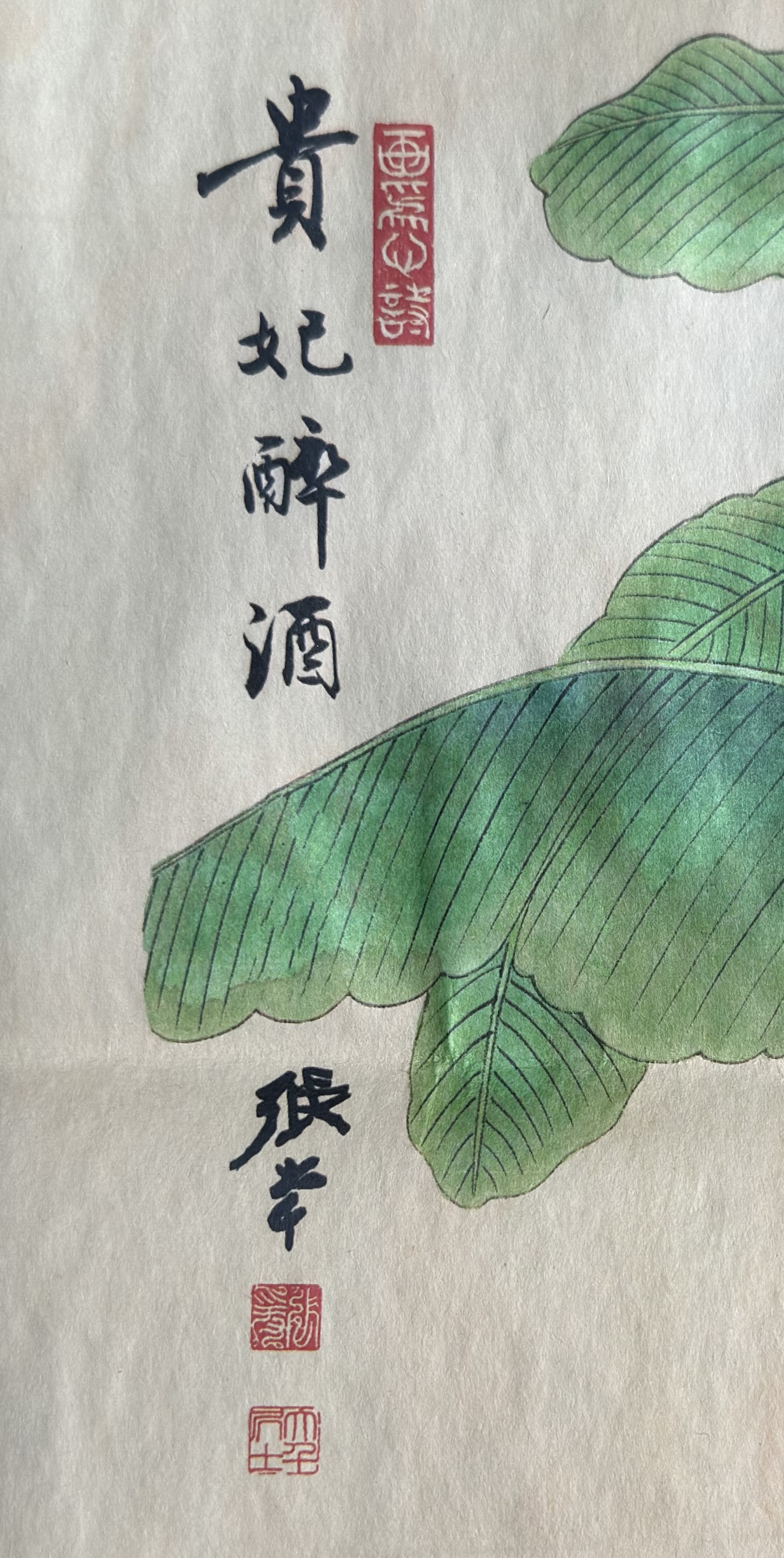 背景中翠绿饱满的芭蕉叶铺陈成层次分明的空间感,与前景人物衣袖的流线构成鲜明对比。张大千以遒劲的线条勾勒人物体态,运笔稳健而富节奏感;同时通过浓淡相宜的设色,使人物肌理柔润,衣饰转折间显露出唐人审美中的丰腴与典雅。画上题识笔力深厚,书法与画面融为一体,增添了作品的文人气息。