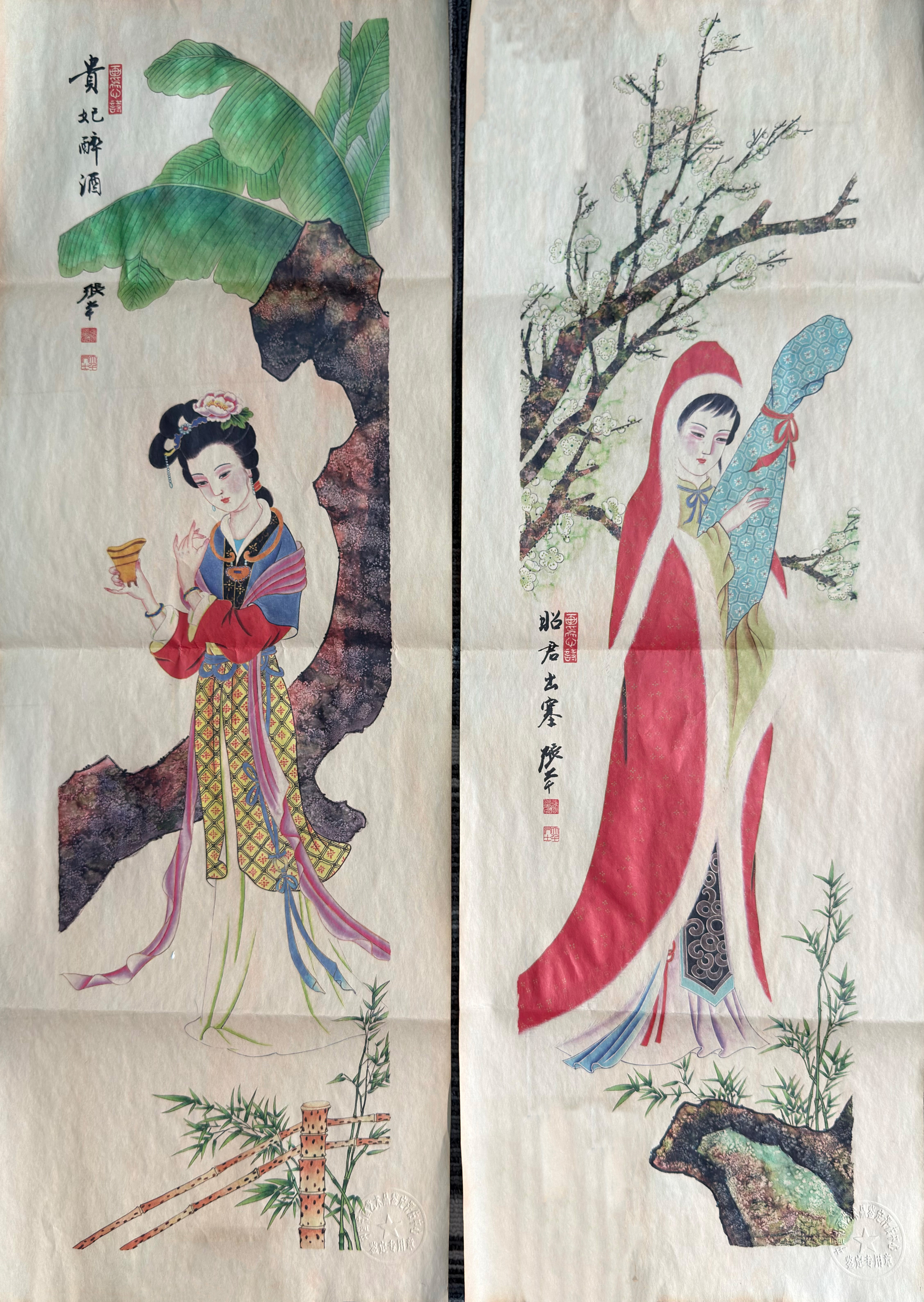 张大千(1899-1983)是中国近现代画坛最具影响力的艺术巨匠之一,他在继承传统文人画精神的同时,又深受敦煌艺术的启发,使仕女画焕发出古典与新意并存的独特风格。这组作品为《昭君出塞》与《贵妃醉酒》两条屏,单幅尺寸为71cm × 25cm,以工笔重彩绘制,兼具线条的精致与色彩的典雅,展现了两位历史传奇女性的绝代风华。