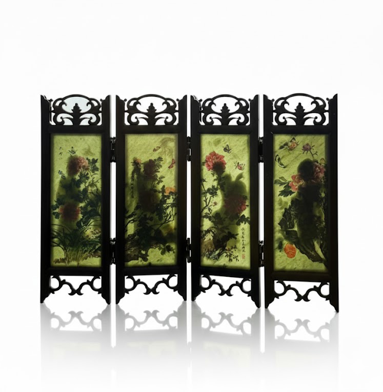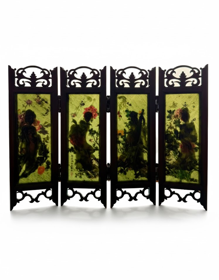 整件屏风由四扇玉板相连,碧玉透光温润,人物浮雕在光线映衬下层次分明。暗香盈动的花卉背景与仕女姿态相得益彰,构成一幅静谧典雅的玉雕画卷。木质镂空框架勾勒出古朴线条,更添几分文人书房的陈设意趣。