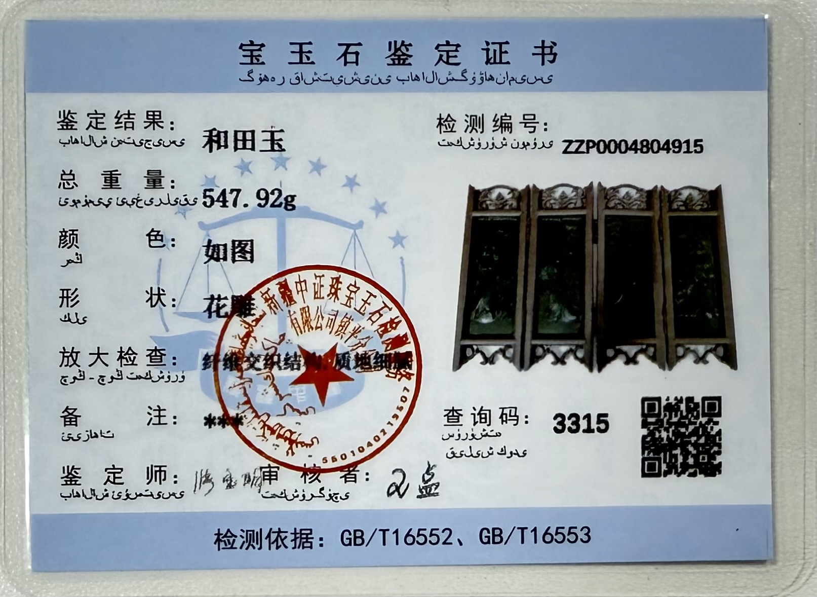 作品配有权威宝玉石鉴定证书,详细记录其547.92克的重量及纤维交织结构等检测数据,专业验证了玉石的天然属性与上乘品质,为藏家提供可靠依据。