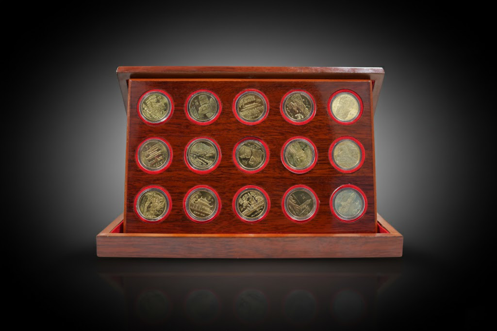 全集采用典雅的实木展示盒包装,15枚纪念币分三行有序排列,造型庄重,布局整齐。金色币面与木质底座相互映衬,形成视觉上的庄严与典雅,无论置于书房还是展柜,都展现出非凡的艺术气度与收藏规格。