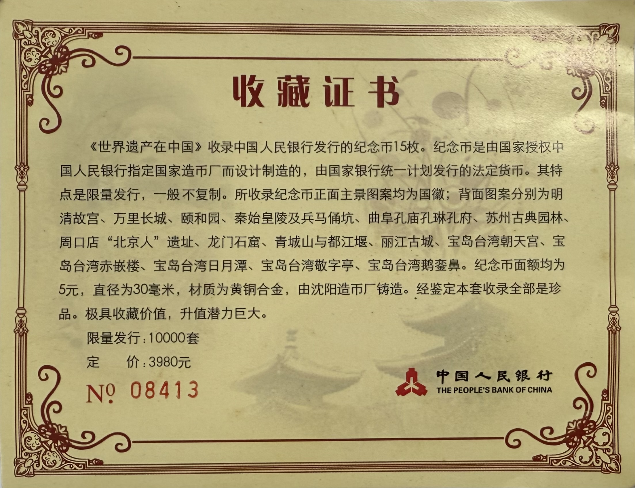 这套《世界遗产在中国》纪念币全集,凝聚了国家对文化遗产保护的敬意,也让世人得以通过一枚枚纪念币,触摸历史的温度,感受文明的光辉。它不仅是货币,更是一份可传承的文化印记。
