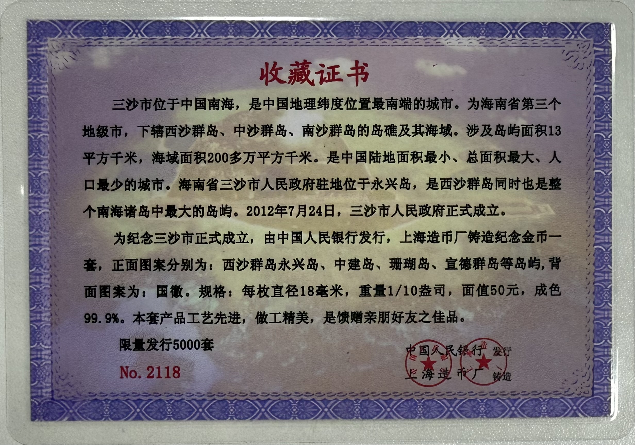 2012年,海南省三沙市正式成立,标志着中国在南海地区行政管理体系的完善与深化。为纪念这一具有重要历史意义的时刻,中国人民银行特别发行了《三沙市成立纪念金币套装》,由上海造币厂铸造完成。