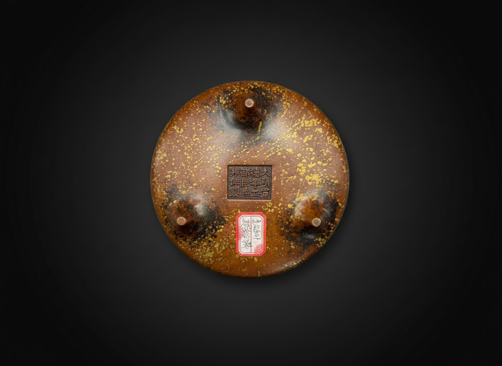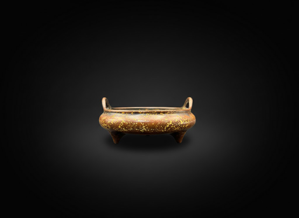 这件过桥双耳三足炉在沉稳与精致之间取得了绝妙平衡,洒金闪烁的表面与敦厚端方的造型相互映衬,既具文房陈设之雅趣,又蕴历史文化之底蕴,堪称明代文人器用美学的典型体现。