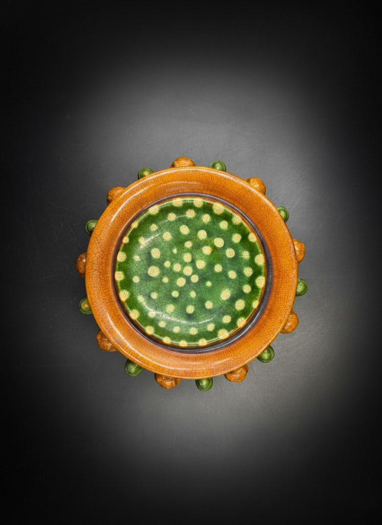 俯瞰器物顶部,可见洗心满施苍翠的绿釉,间以明亮的黄色梅花点纹,色彩层次分明,富有律动之美。外围厚重的琥珀釉环绕一周,与内圈的点彩形成强烈对比,既稳重又灵动,令整器在光影下更显莹润通透。