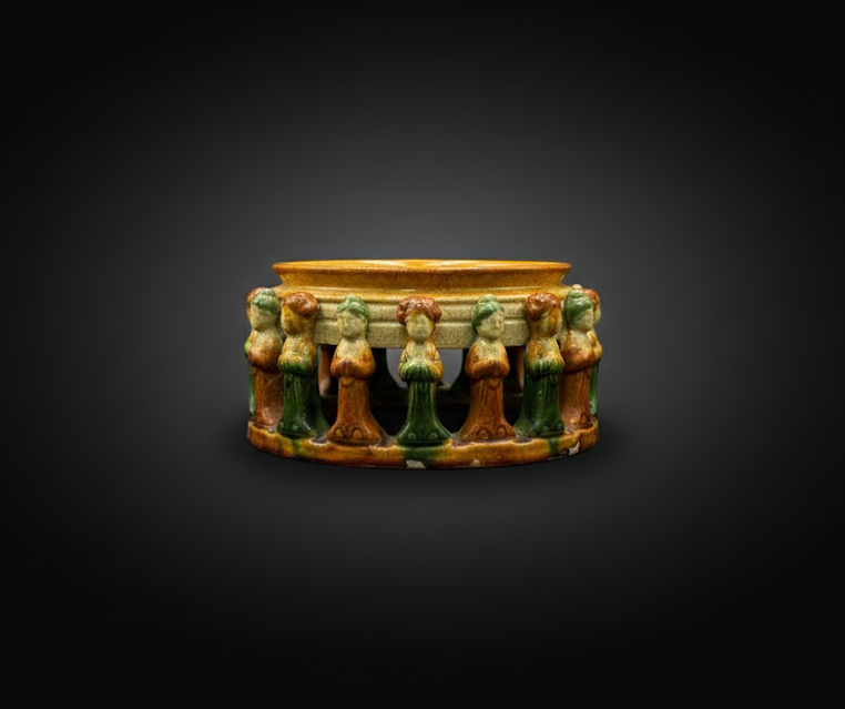 器身侧面采用立雕镂空工艺,环绕分布一圈侍女立像,神态安宁,双手合十。侍女衣袍以黄、绿两色交替上釉,色彩明快却不失典雅。人物姿态与洗盘结构巧妙结合,使文房用器兼具观赏与功能双重价值。