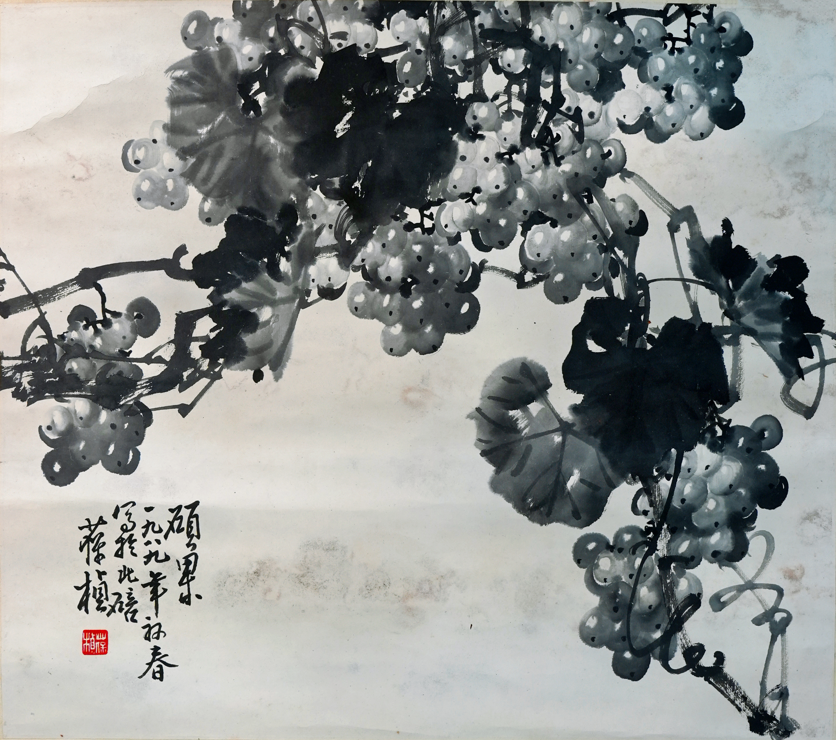 笔墨酣畅,意境高远。苏葆桢以水墨写葡萄,气韵生动,雅逸清润,尽显近代花鸟画风神。