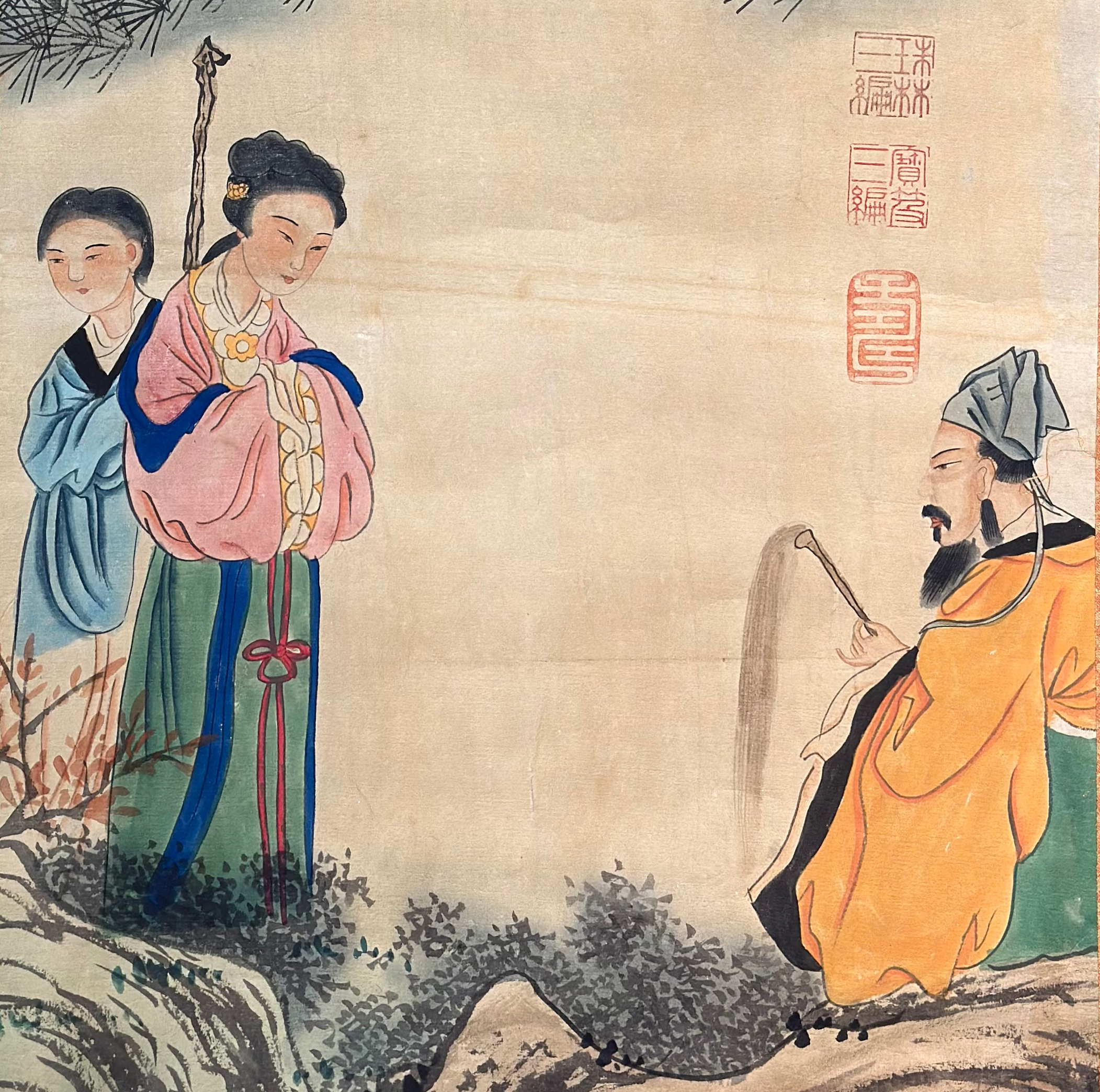 画面松下人物神态生动,笔墨清逸,寓意道法传承与别情依依,展现出宋人笔意的高雅。