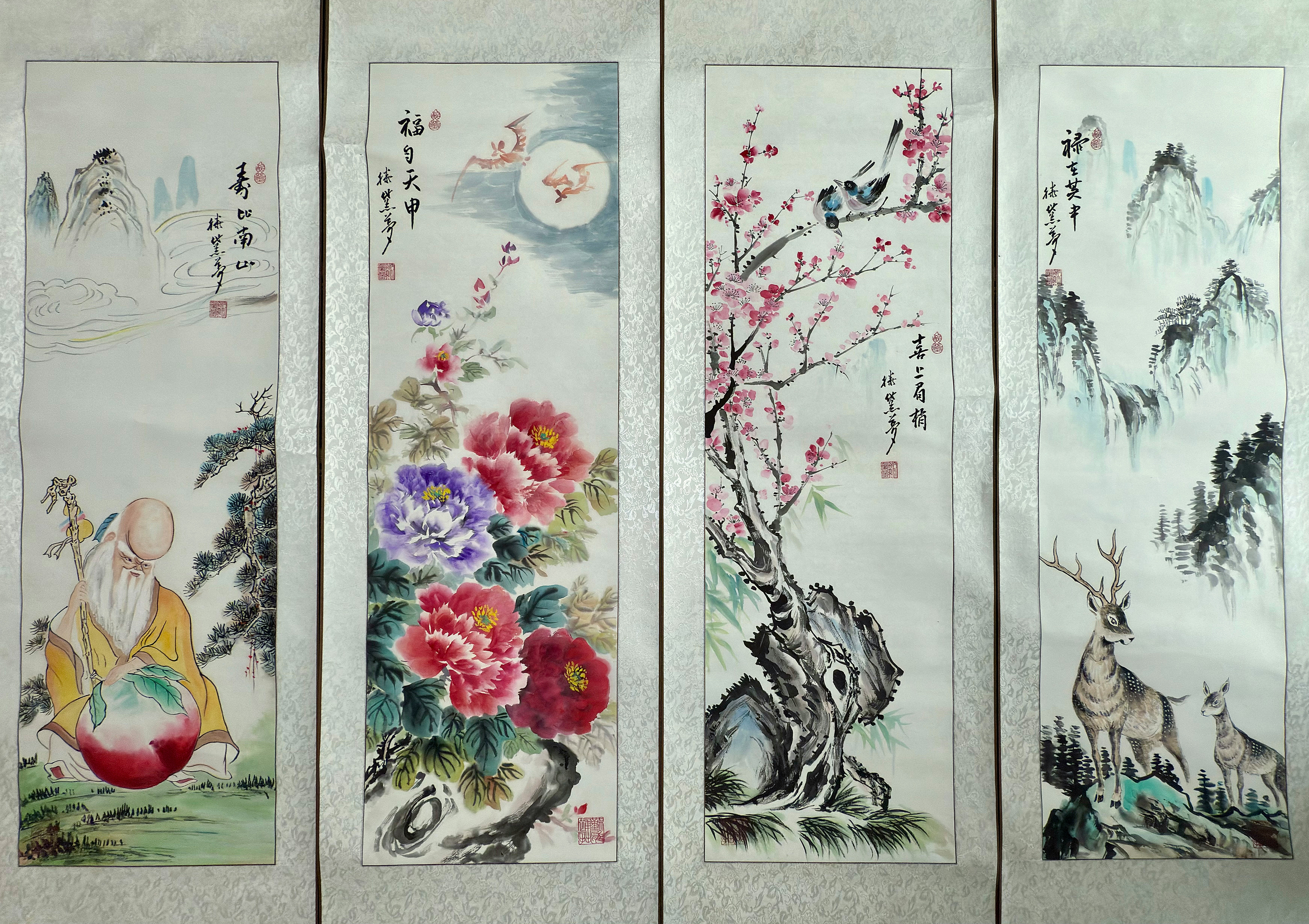 滕黛梦《福禄寿喜》四条屏以花鸟人物寓意吉祥,工笔与写意相结合,笔墨精致、色彩明丽,表达了中国传统文化中对福寿安康。