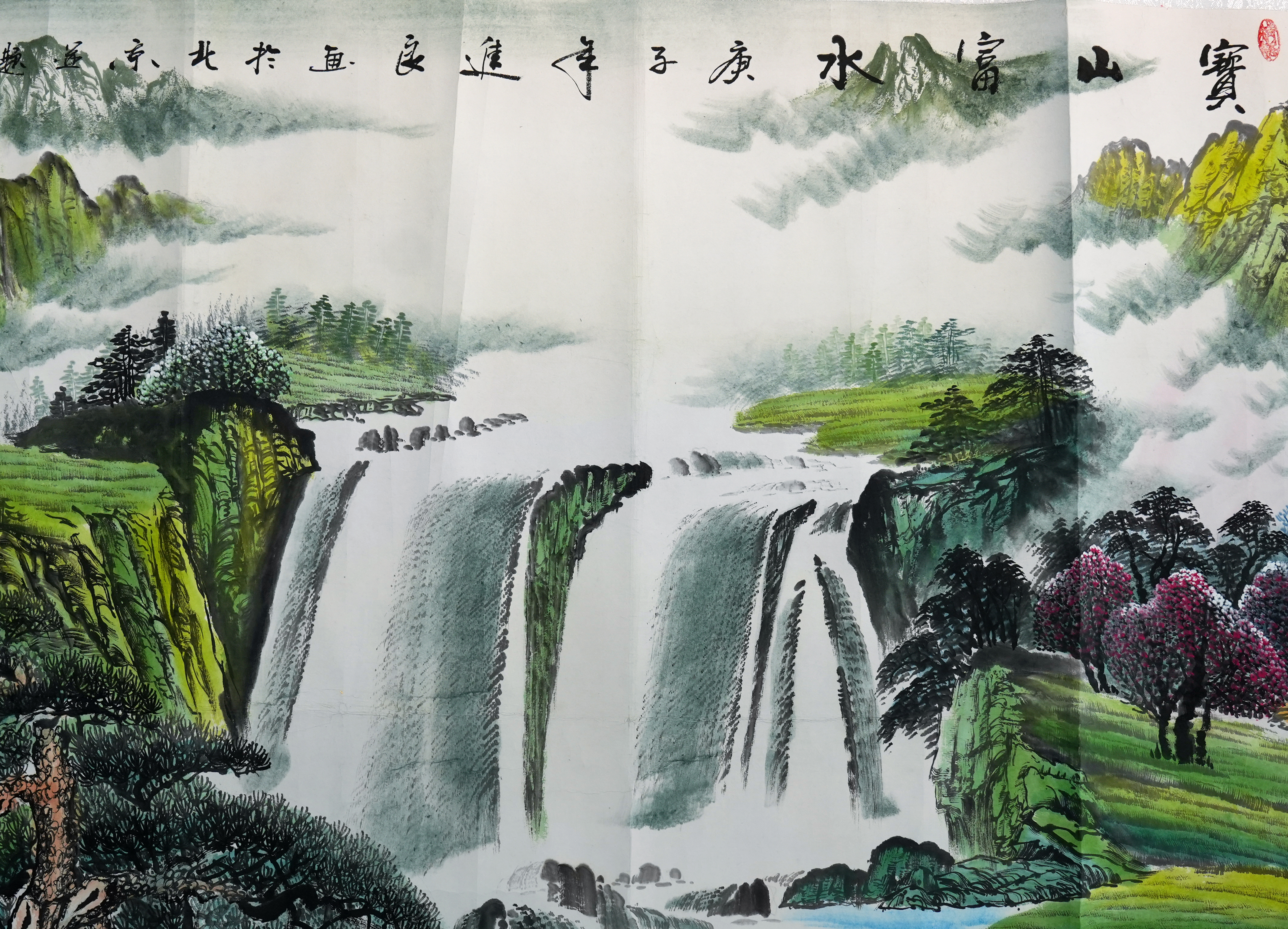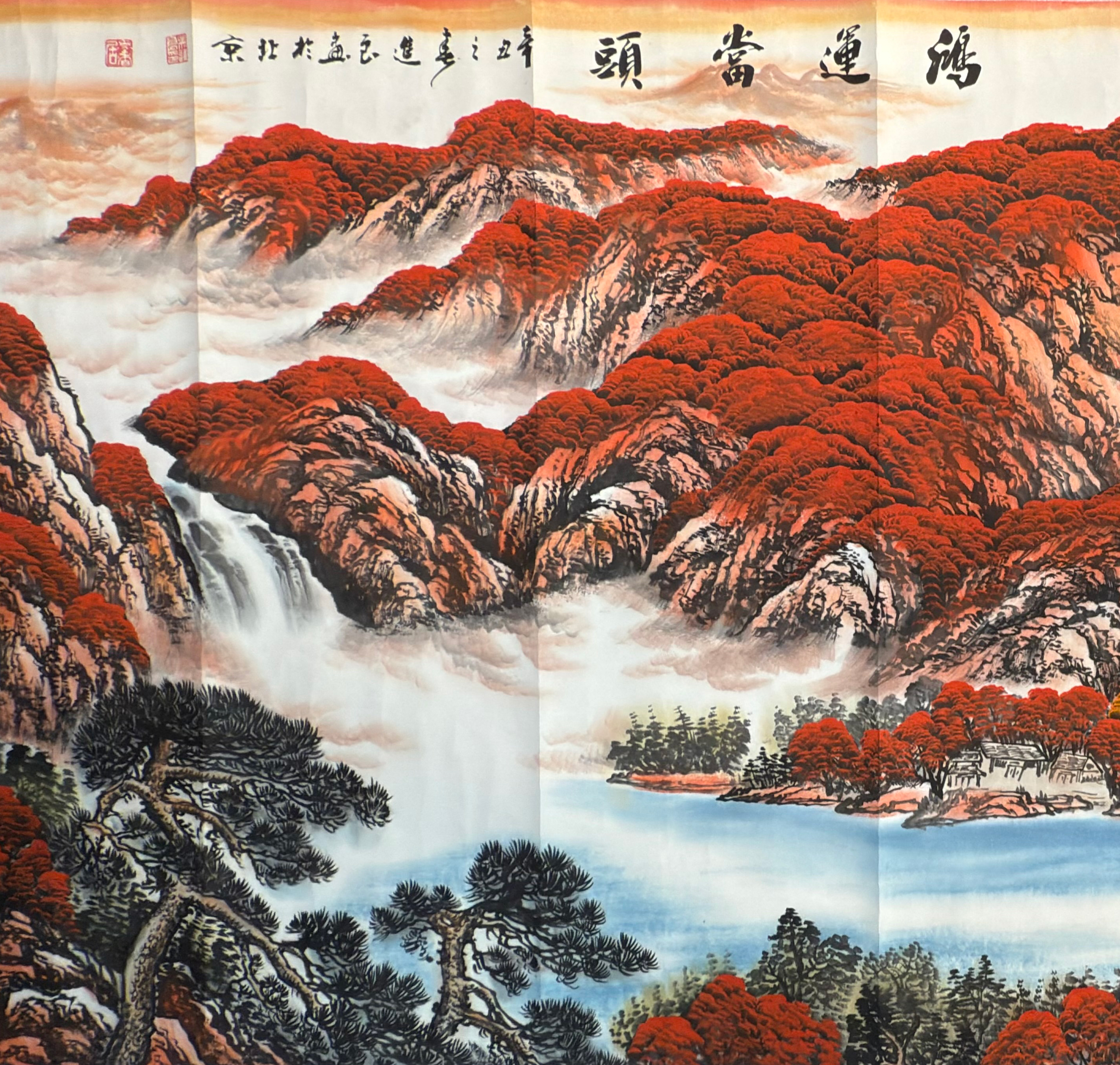以朱红色调山峦为主,象征“鸿运当头”,瀑布飞流直下,构图大气磅礴、气势恢宏的现代山水画佳作。
