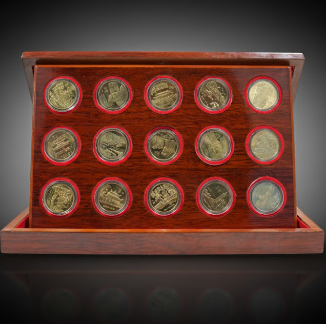 沈阳造币厂铸造,全套十五枚,展现中华文明的标志性遗产景观,黄铜合金材质,限量一万套。