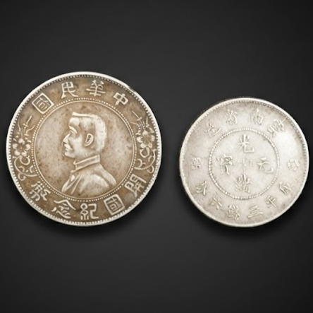 孙中山像开国纪念币与云南省造光绪元宝,呈现清末民初币制更替与时代变迁。