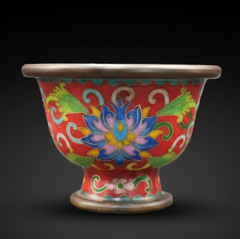 红釉为地,色泽深沉稳重,外壁掐丝描绘宝相花纹,花色明丽、线条流畅,工艺考究。