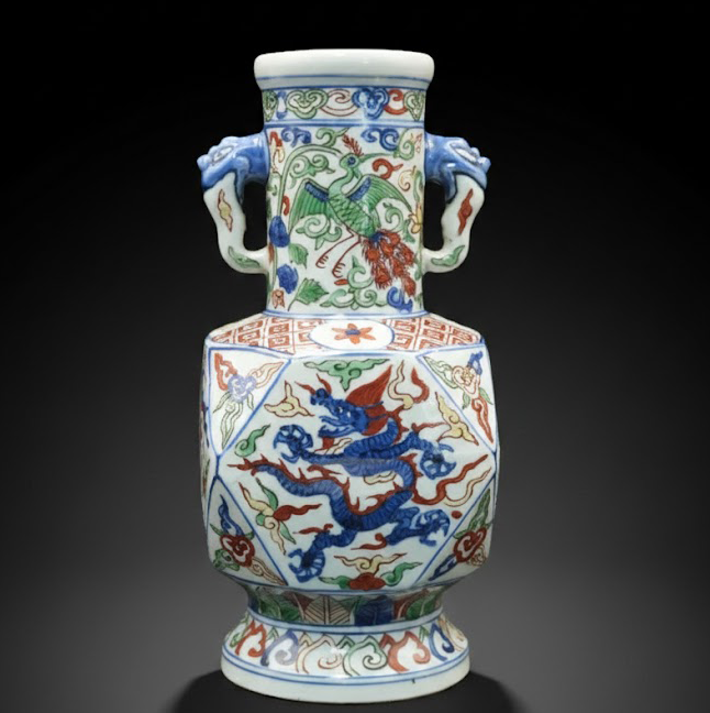 造型方圆并济,纹饰繁丽,色彩浓艳。龙凤呈祥,象耳寓意太平。