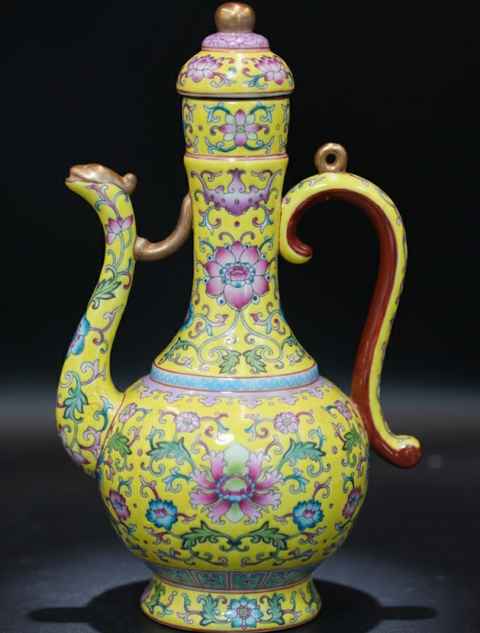 造型仿自僧帽壶样式,黄釉明艳,粉彩描金精致,华贵典雅,尽显民国仿古瓷风韵。