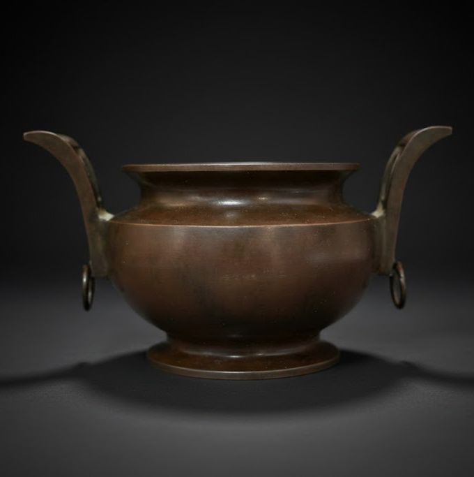 铜质细腻,皮壳深沉温润。器形端庄稳重,戟耳挺拔有力,底款“宣”字遒劲古雅,尽显明清宣德炉的典型风韵。