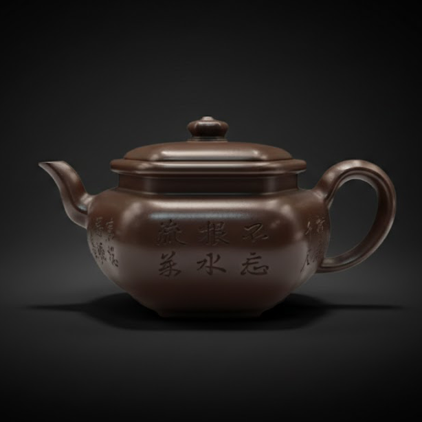 方中寓圆之构,展现出严谨的造型与深厚的文化底蕴。泥质醇厚,线条挺拔,刻饰松石生韵,尽显匠心之美。